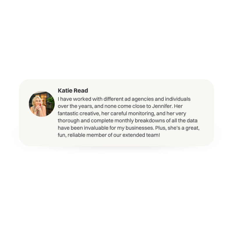 "Jennifer makes suggestions on how to improve our ads, decrease ad spend, etc. She REALLY looks out for us and our business." — Private Practice Startup